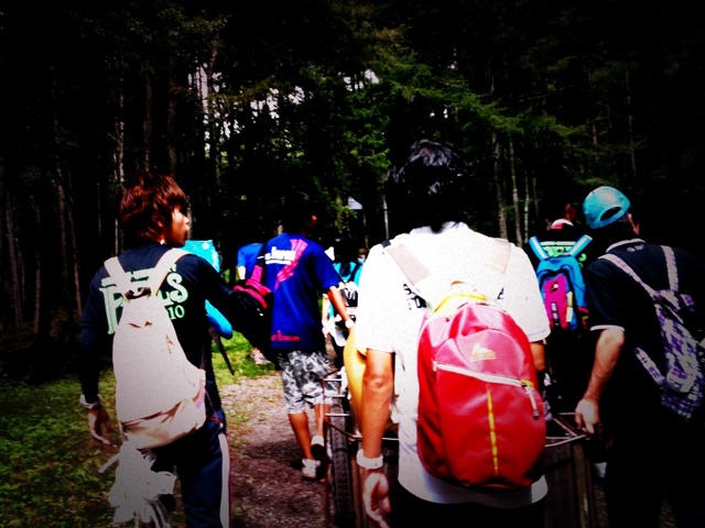そこに、タオルで目隠しした私達が一列に並んで、左手でロープ、右手で前の人の肩を掴んで、