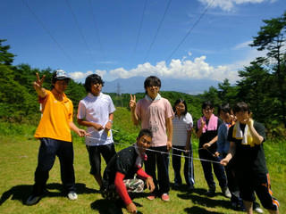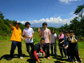 ここの課題は、輪になったでっかいゴムを全員で持ち、1人も手を離すことなく