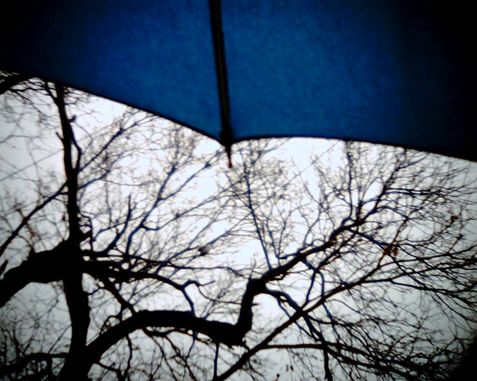 雨の日は青い傘の中でレンズを通して世界を眺める